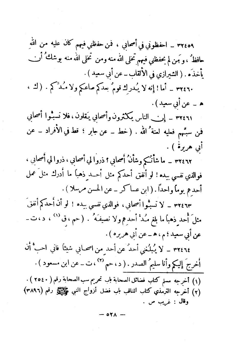 32463- لا تسبوا أصحابي، فوالذي نفسي بيده! لو أن أحدكم أنفق مثل أحد ذهبا ما بلغ مد أحدهم ولا نصيفه. "حم، ق 1، د، ت - عن أبي سعيد؛ م، هـ - عن أبي هريرة".