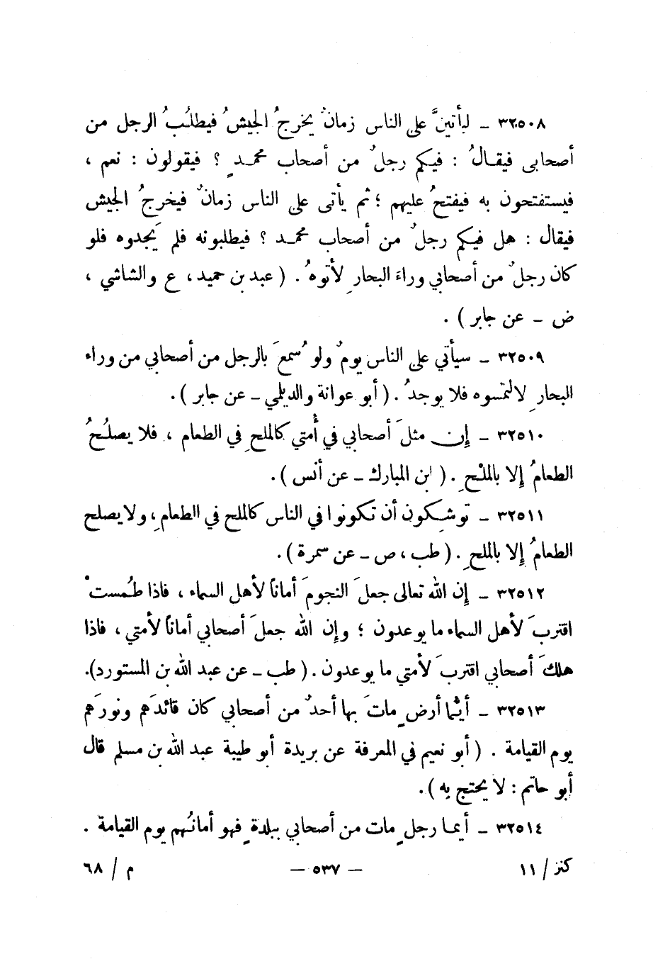 32513- أيما أرض مات بها أحد من أصحابي كان قائدهم ونورهم يوم القيامة. "أبو نعيم في المعرفة عن بريدة أبو طيبة عبد الله بن مسلم قال أبو حاتم: لا يحتج به".