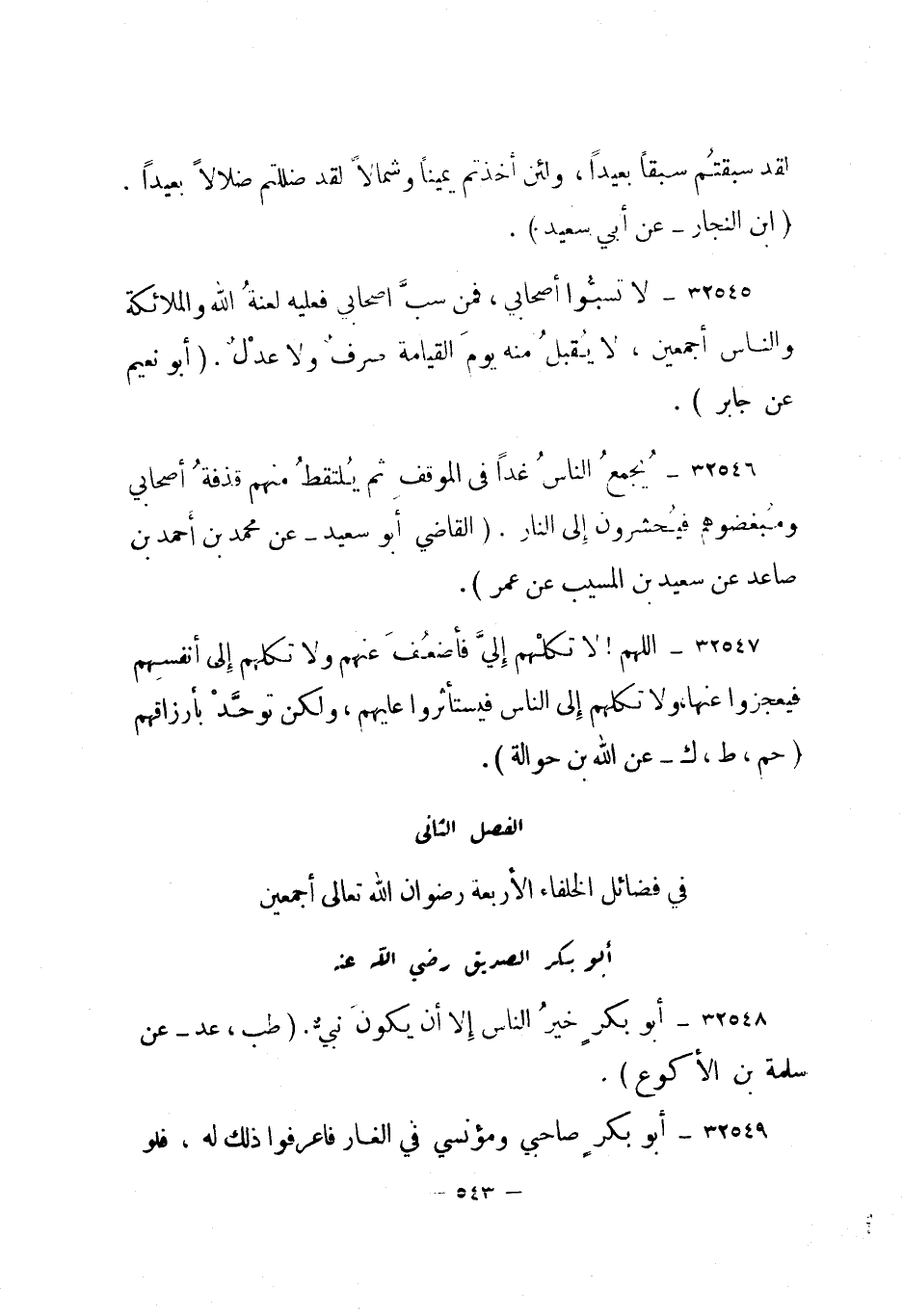32545- لا تسبوا أصحابي، فمن سب أصحابي فعليه لعنة الله والملائكة والناس أجمعين، لا يقبل منه يوم القيامة صرف ولا عدل. "أبو نعيم عن جابر".