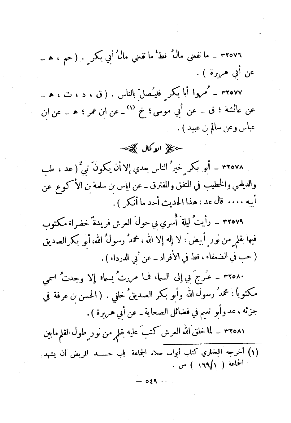 32579- رأيت ليلة أسري بي حول العرش فريدة خضراء مكتوب فيها بقلم من نور أبيض: لا إله إلا الله، محمد رسول الله، أبو بكر الصديق. "حب في الضعفاء، قط في الأفراد - عن أبي الدرداء".
