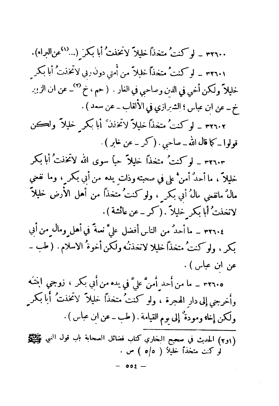 1 الحديث في صحيح البخاري كتاب فضائل الصحابة باب قول النبي صلى الله عليه وسلم لو كنت متخذا خليلا "5/5" ص.
