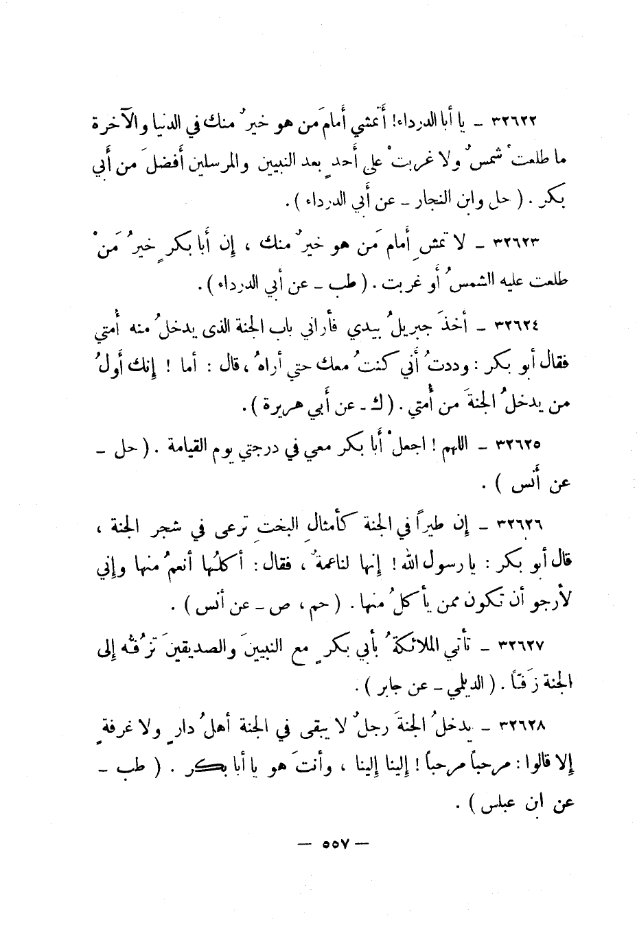 32623- لا تمش أمام من هو خير منك، إن أبا بكر خير من طلعت عليه الشمس أو غربت. "طب - عن أبي الدرداء".
