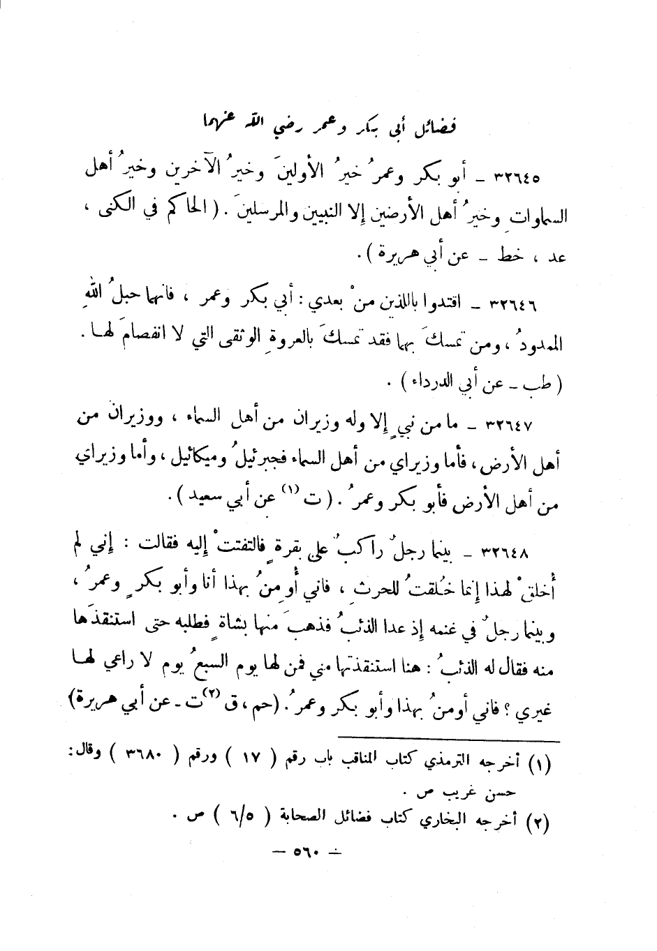 32647- ما من نبي إلا وله وزيران من أهل السماء، ووزيران من أهل الأرض، فأما وزيراي من أهل السماء فجبرئيل وميكائيل، وأما وزيراي من أهل الأرض فأبو بكر وعمر. "ت 1 عن أبي سعيد".