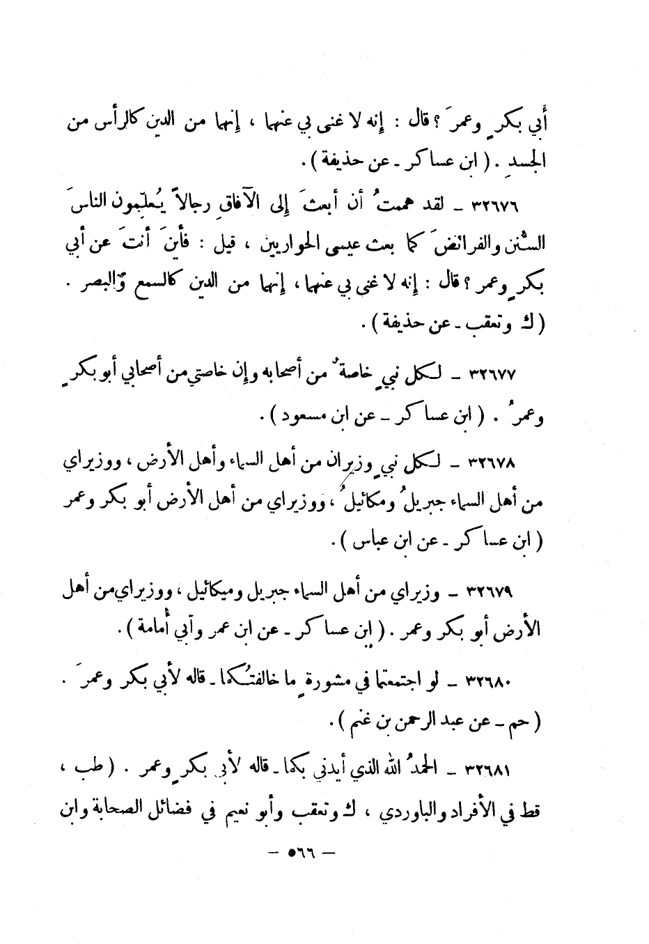 32679- وزيراي من أهل السماء جبريل وميكائيل، ووزيراي من أهل الأرض أبو بكر وعمر. "ابن عساكر - عن ابن عمر وأبي أمامة".