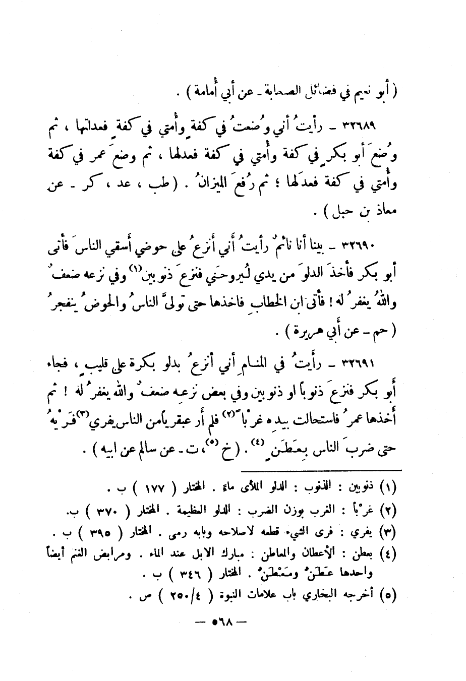 32690- بينا أنا نائم رأيت أني أنزع على حوضي أسقي الناس فأتى أبو بكر فأخذ الدلو من يدي ليروحني فنزع ذنوبين 1 وفي نزعه ضعف والله يغفر له! فأتى ابن الخطاب فأخذها حتى تولى الناس والحوض ينفجر. "حم - عن أبي هريرة".