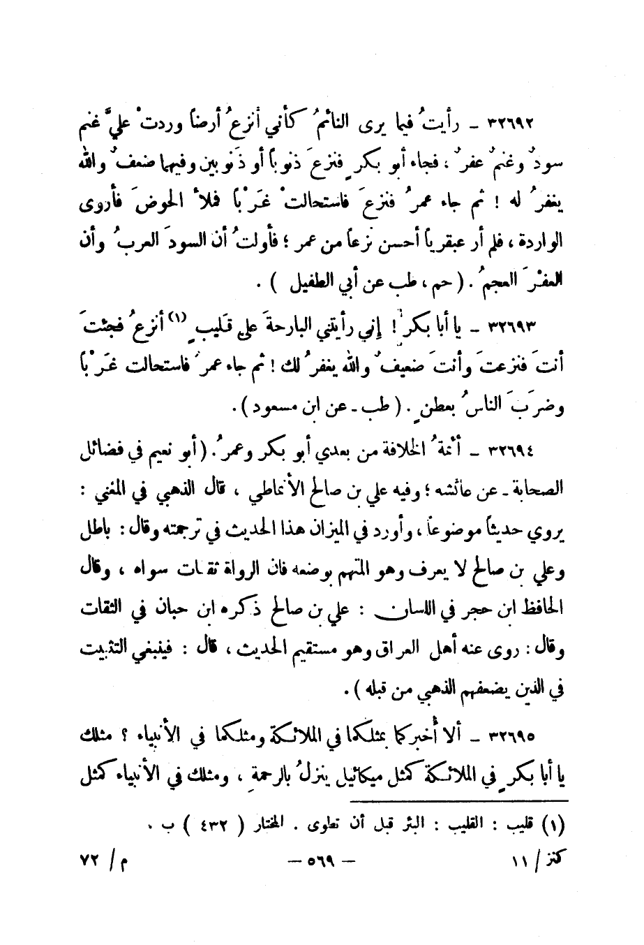 32693- يا أبا بكر! إني رأيتني البارحة على قليب 1 أنزع فجئت أنت فنزعت وأنت ضعيف والله يغفر لك! ثم جاء عمر فاستحالت غربا وضرب الناس بعطن. "طب - عن ابن مسعود".