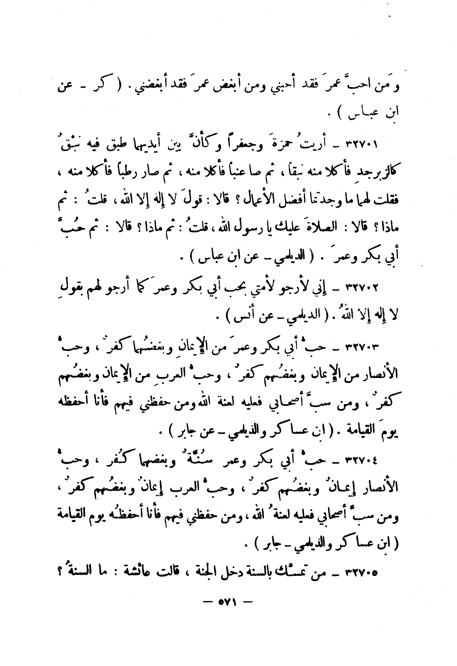 32704- حب أبي بكر وعمر سنة وبغضهما كفر، وحب الأنصار إيمان وبغضهم كفر، وحب العرب إيمان وبغضهم كفر، ومن سب أصحابي فعليه لعنة الله، ومن حفظني فأنا أحفظه يوم القيامة. "ابن عساكر والديلمي - عن جابر".