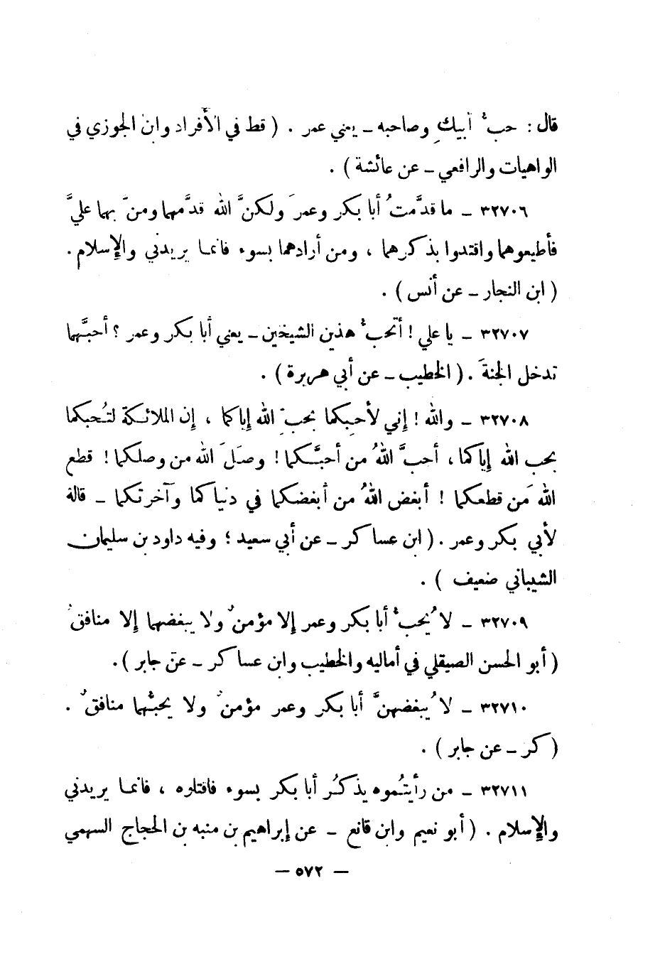 32707- يا علي! أتحب هذين الشيخين - يعني أبا بكر وعمر؟ أحبهما تدخل الجنة. "الخطيب - عن أبي هريرة".