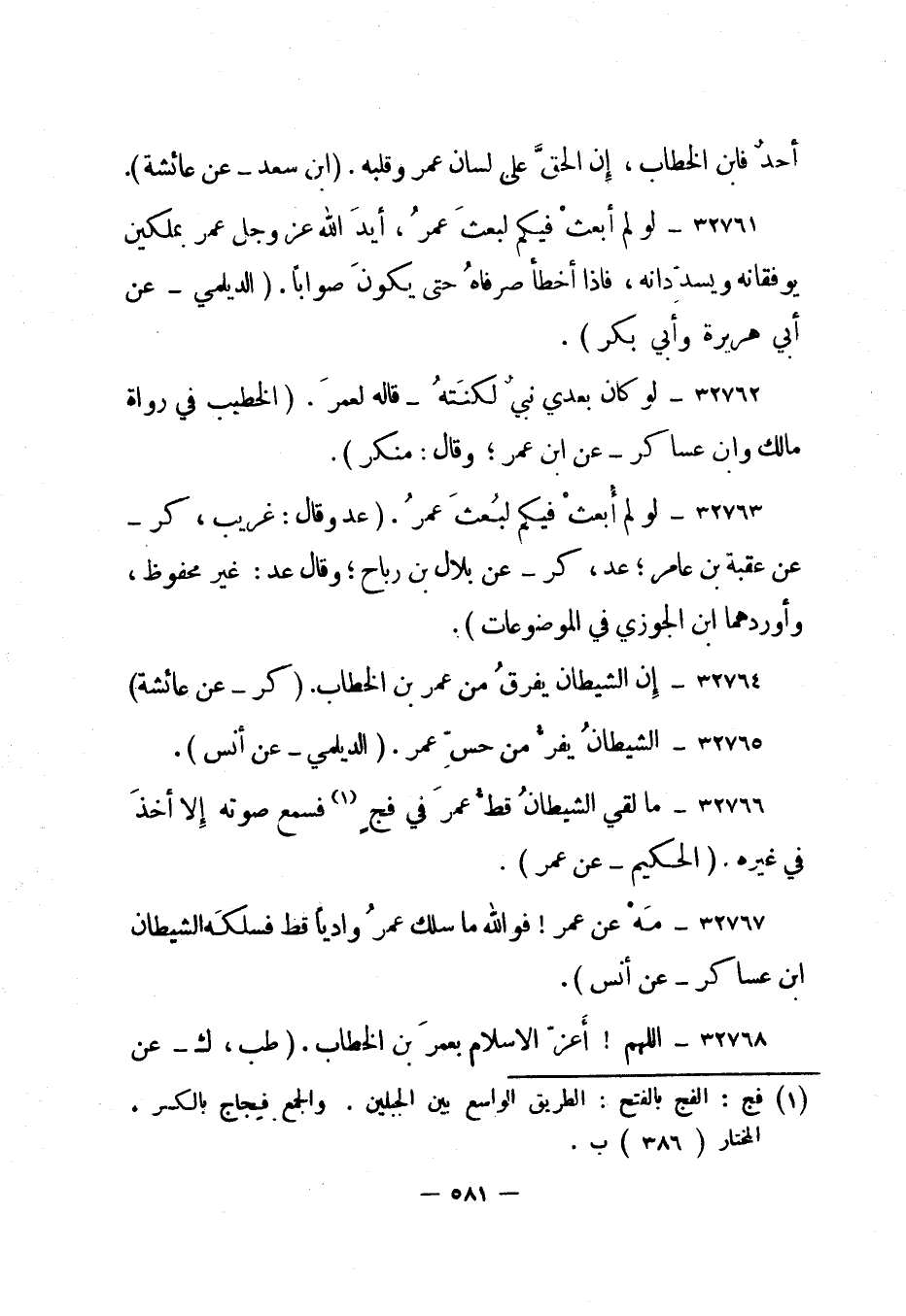 32766- ما لقي الشيطان قط عمر في فج 1 فسمع صوته إلا أخذ في غيره. "الحكيم - عن عمر".