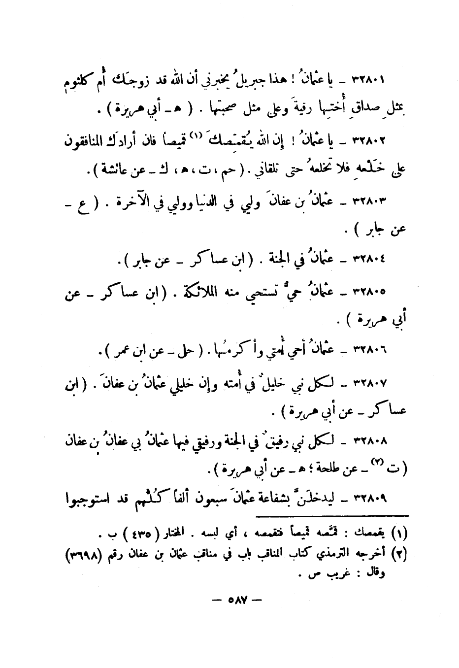32808- لكل نبي رفيق في الجنة ورفيقي فيها عثمان بن عفان. "ت 2 - عن طلحة؛ هـ - عن أبي هريرة".