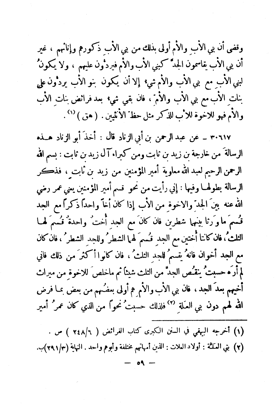 30617- عن عبد الرحمن بن أبي الزناد قال: أخذ أبو الزناد هذه الرسالة من خارجة بن زيد بن ثابت ومن كبراء آل زيد بن ثابت: بسم الله الرحمن الرحيم لعبد الله معاوية أمير المؤمنين من زيد بن ثابت، فذكر الرسالة بطولها وفيها: إني رأيت من نحو قسم أمير المؤمنين يعني عمر رضي الله عنه بين الجد والإخوة من الأب إذا كان أخا واحدا ذكرا مع الجد قسم ما ورثا بينهما شطرين فإن كان مع الجد أخت واحدة قسم لها الثلث، فإن كانتا أختين مع الجد قسم لهما الشطر وللجد الشطر، فإن كان مع الجد أخوان فإنه يقسم للجد الثلث، فإن كانوا أكثر من ذلك فإني لم أره حسبت ينقص الجد من الثلث شيئا ثم ما خلص للإخوة من ميراث أخيهم بعد الجد، فإن بني الأب والأم هم أولى بعضهم من بعض بما فرض الله لهم دون بني العلة 2 فلذلك حسبت نحوا من الذي كان عمر أمير