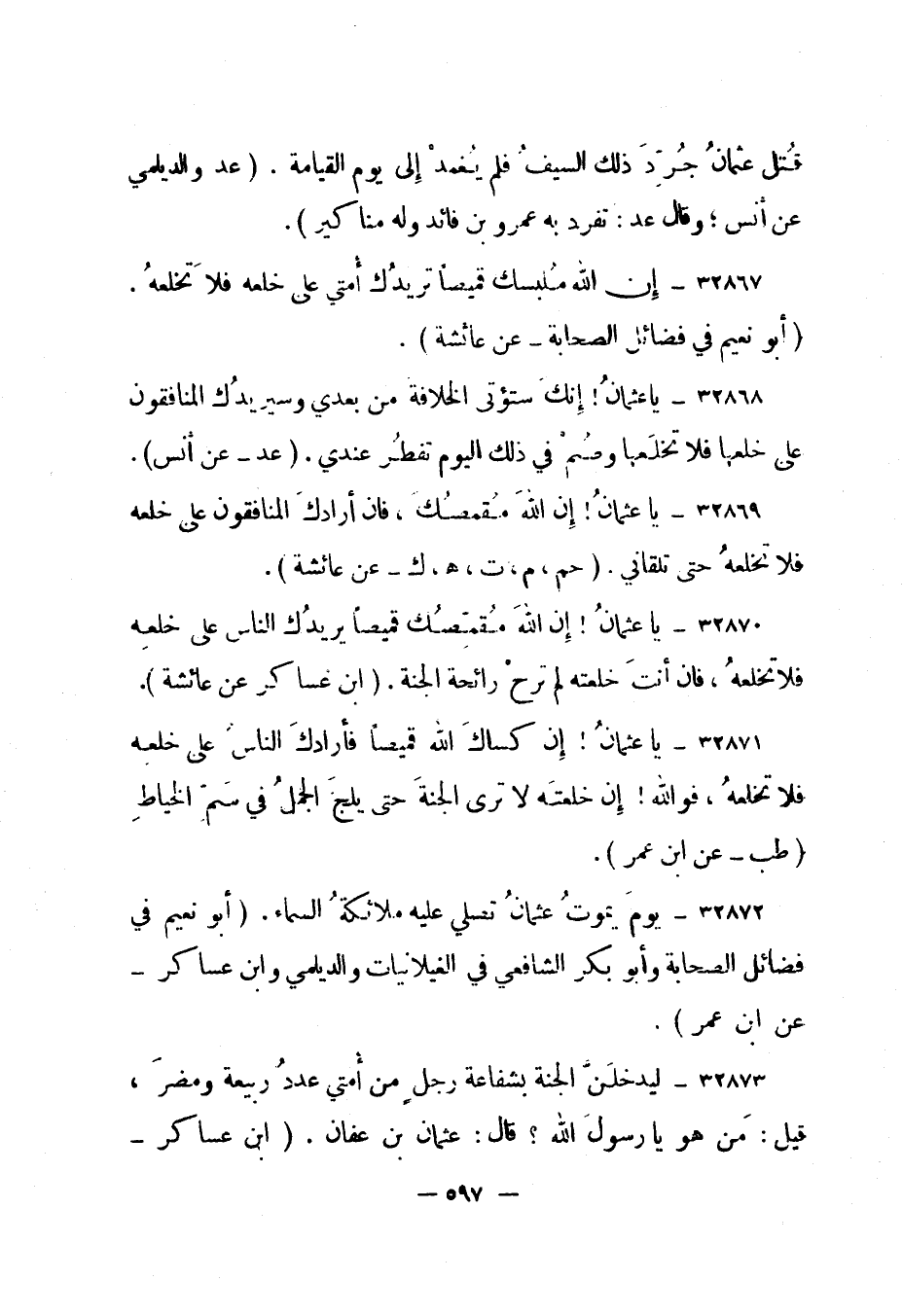 32872- يوم يموت عثمان تصلي عليه ملائكة السماء. "أبو نعيم في فضائل الصحابة وأبو بكر الشافعي في الغيلانيات والديلمي وابن عساكر - عن ابن عمر".