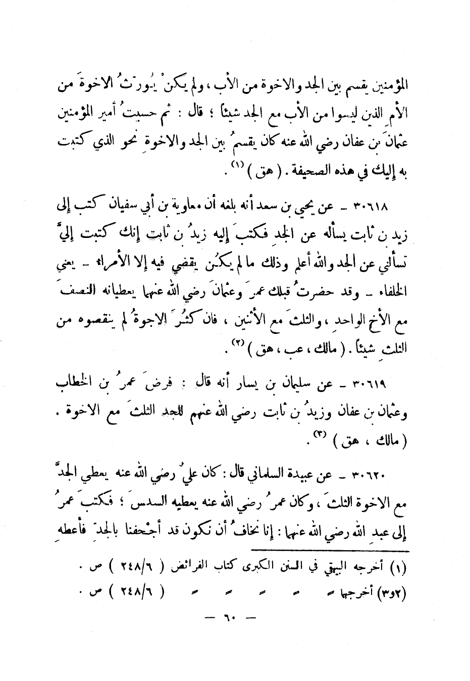 المؤمنين يقسم بين الجد والإخوة من الأب، ولم يكن يورث الإخوة من الأم الذين ليسوا من الأب مع الجد شيئا؛ قال: ثم حسبت أمير المؤمنين عثمان بن عفان رضي الله عنه كان يقسم بين الجد والإخوة نحو الذي كتبت به إليك في هذه الصحيفة. "هق"1.