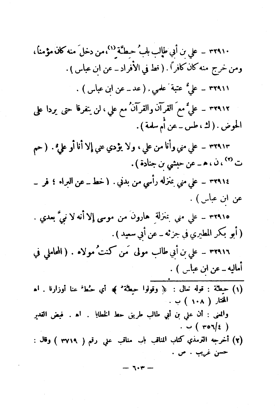 32913- علي مني وأنا من علي، ولا يؤدي عني إلا أنا أو علي. "حم ت 2، ن، هـ - عن حبشي بن جنادة".