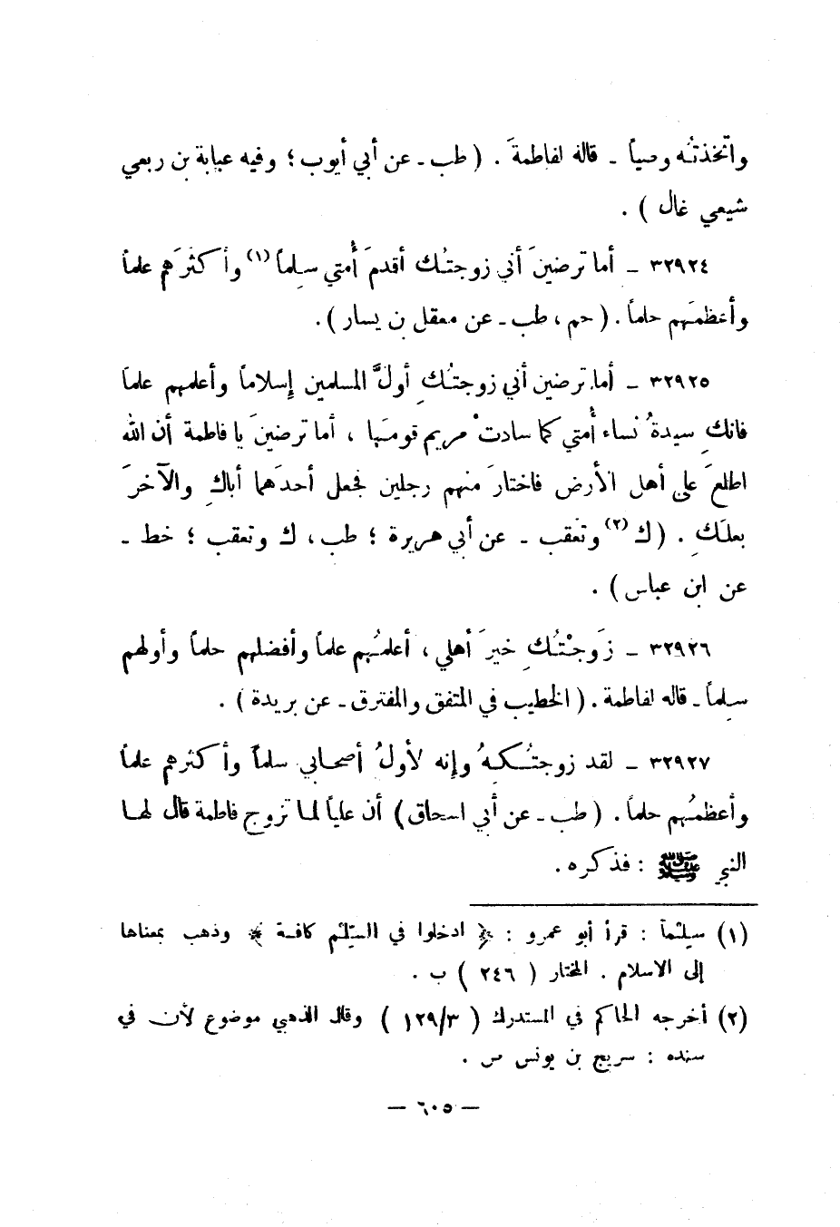 32924- أما ترضين أني زوجتك أقدم أمتي سلما 1 وأكثرهم علما وأعظمهم حلما. "حم، طب - عن معقل بن يسار".