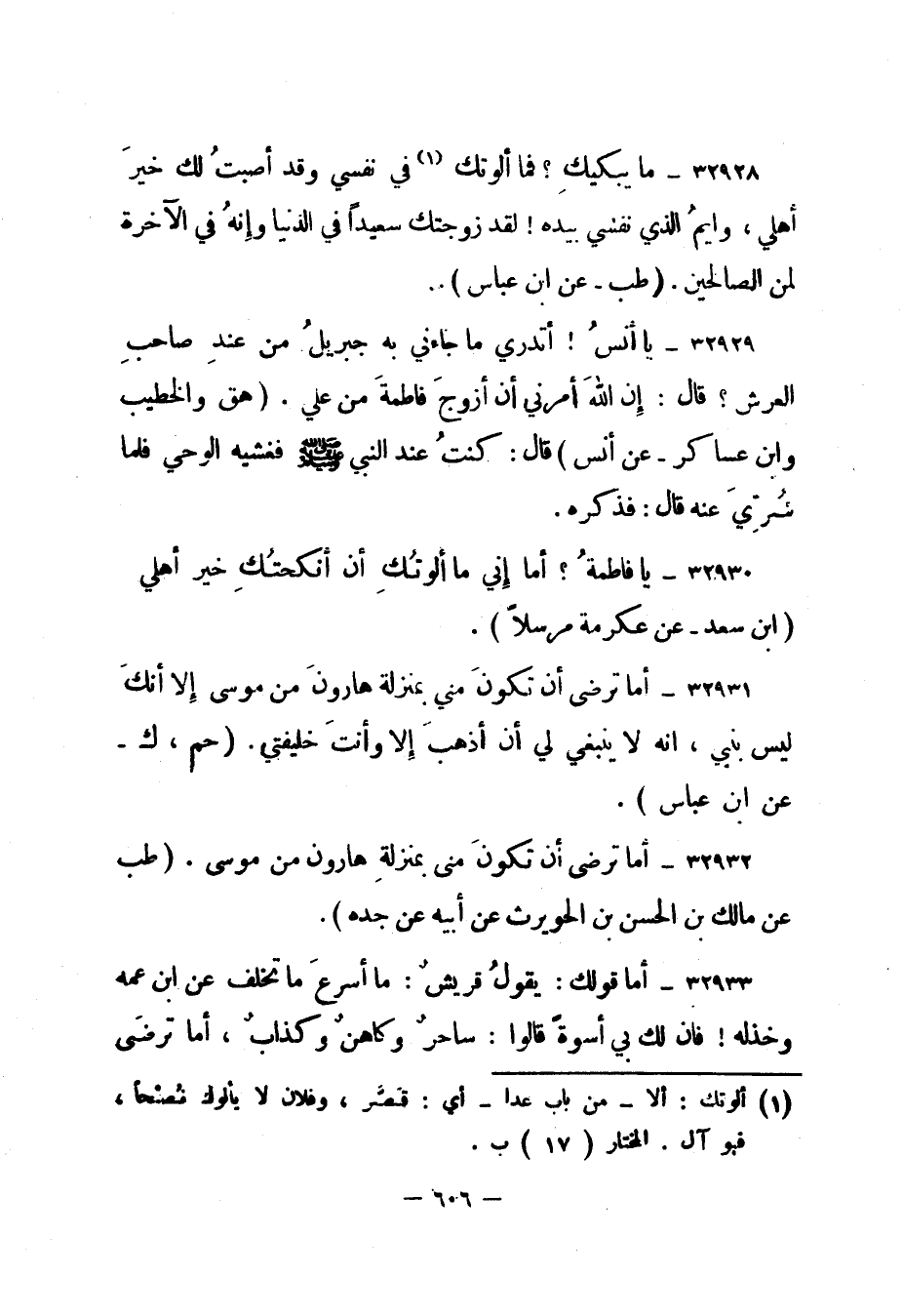 32930- يا فاطمة؟ أما إني ما ألوتك أن أنكحتك خير أهلي. "ابن سعد - عن عكرمة مرسلا".