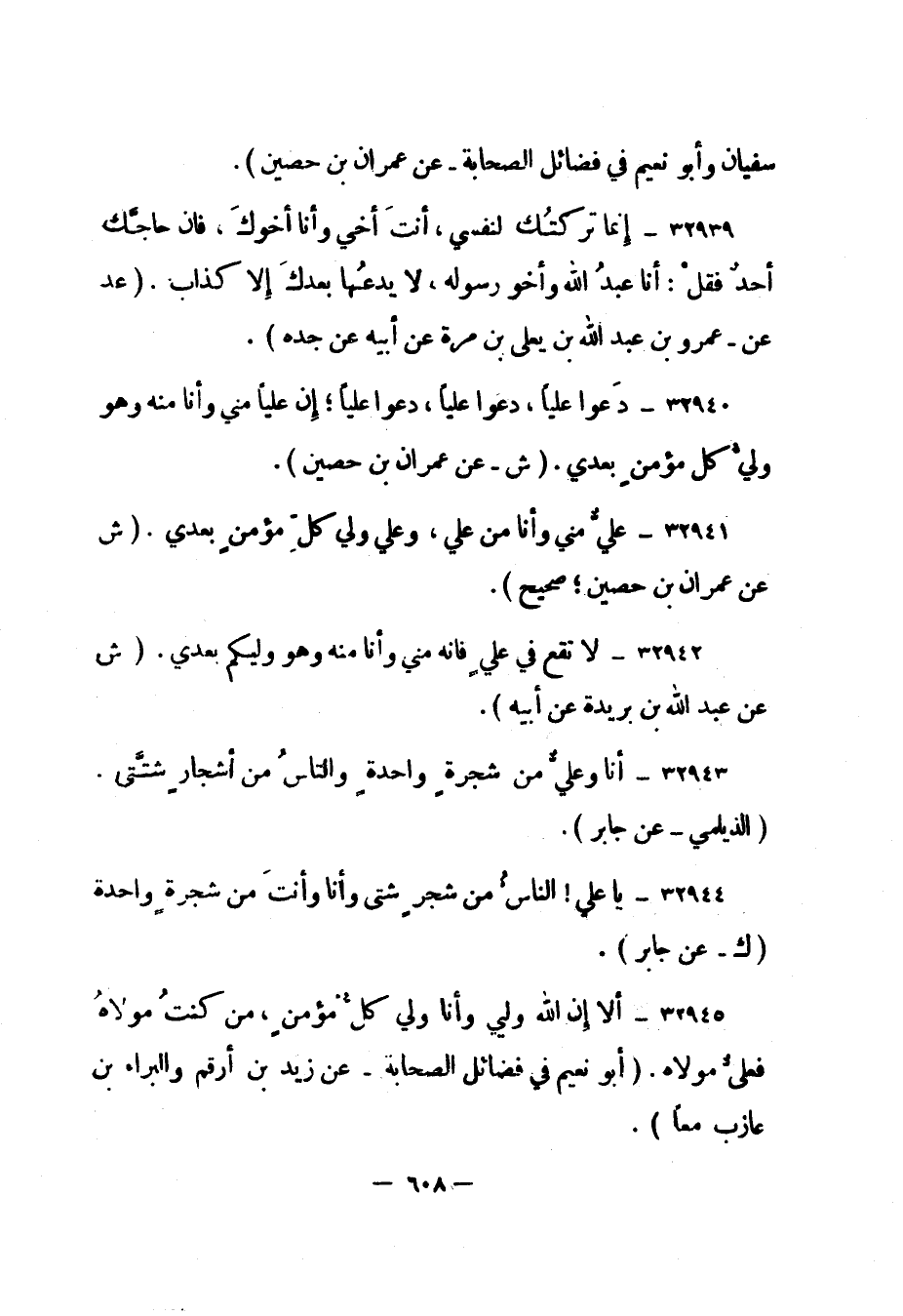 32941- علي مني وأنا من علي، وعلي ولي كل مؤمن بعدي. "ش عن عمران بن حصين؛ صحيح".