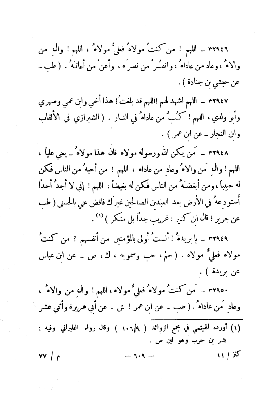32946- اللهم! من كنت مولاه فعلي مولاه، اللهم! وال من والاه، وعاد من عاداه، وانصر من نصره، وأعن من أعانه. "طب - عن حبشي بن جنادة".