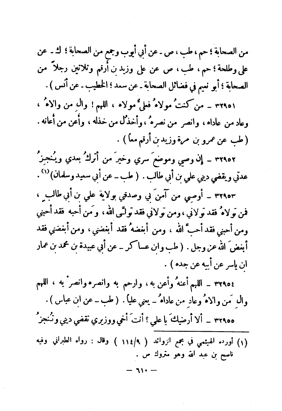 32951- من كنت مولاه فعلي مولاه، اللهم! وال من والاه، وعاد من عاداه، وانصر من نصره، وأخذل من خذله، وأعن من أعانه. "طب عن عمرو بن مرة وزيد بن أرقم معا".