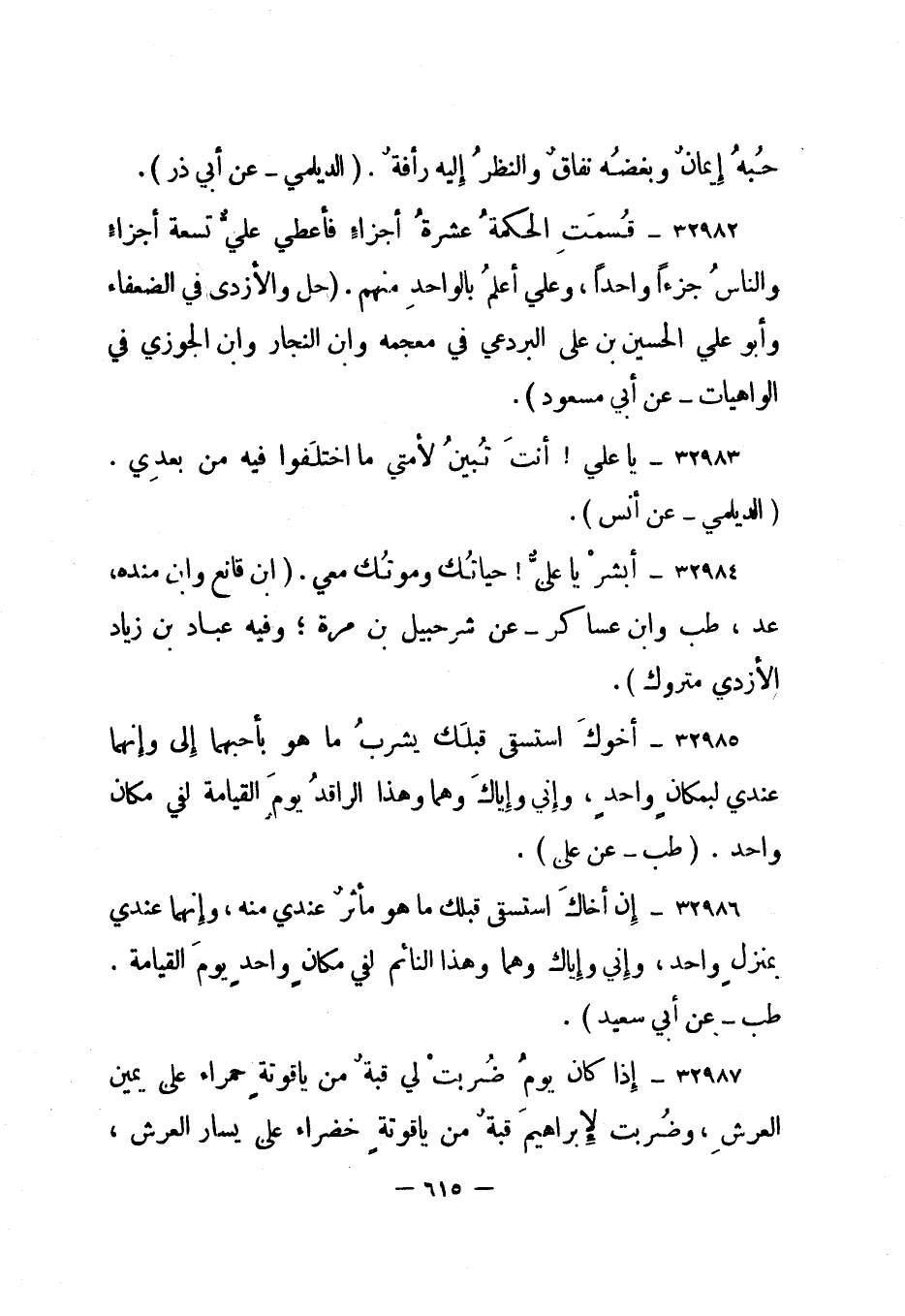 32983- يا علي! أنت تبين لأمتي ما اختلفوا فيه من بعدي. "الديلمي - عن أنس".