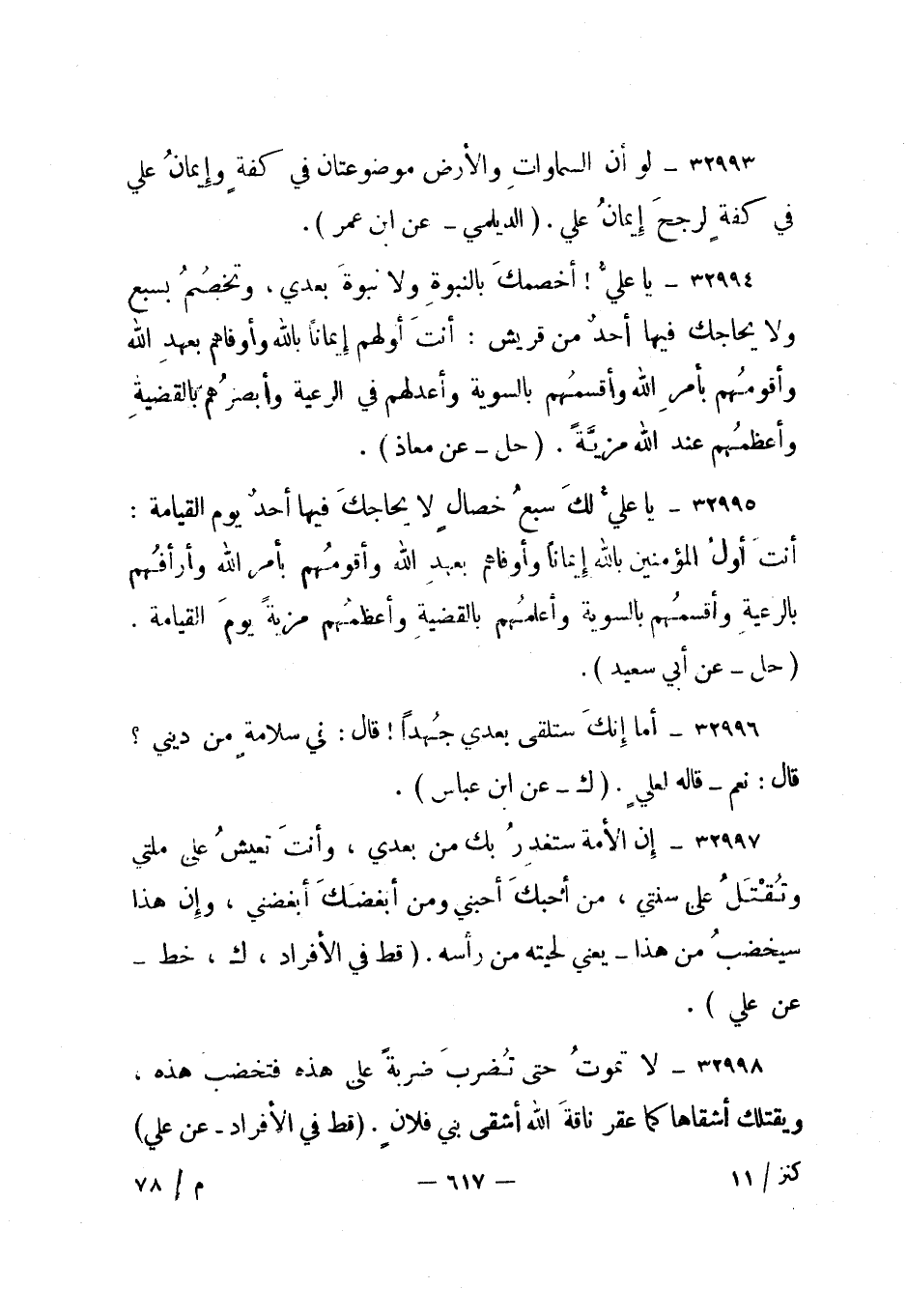 32997- إن الأمة ستغدر بك من بعدي، وأنت تعيش على ملتي وتقتل على سنتي، من أحبك أحبني ومن أبغضك أبغضني، وإن هذا سيخضب من هذا - يعني لحيته من رأسه. "قط في الأفراد، ك، خط - عن علي".