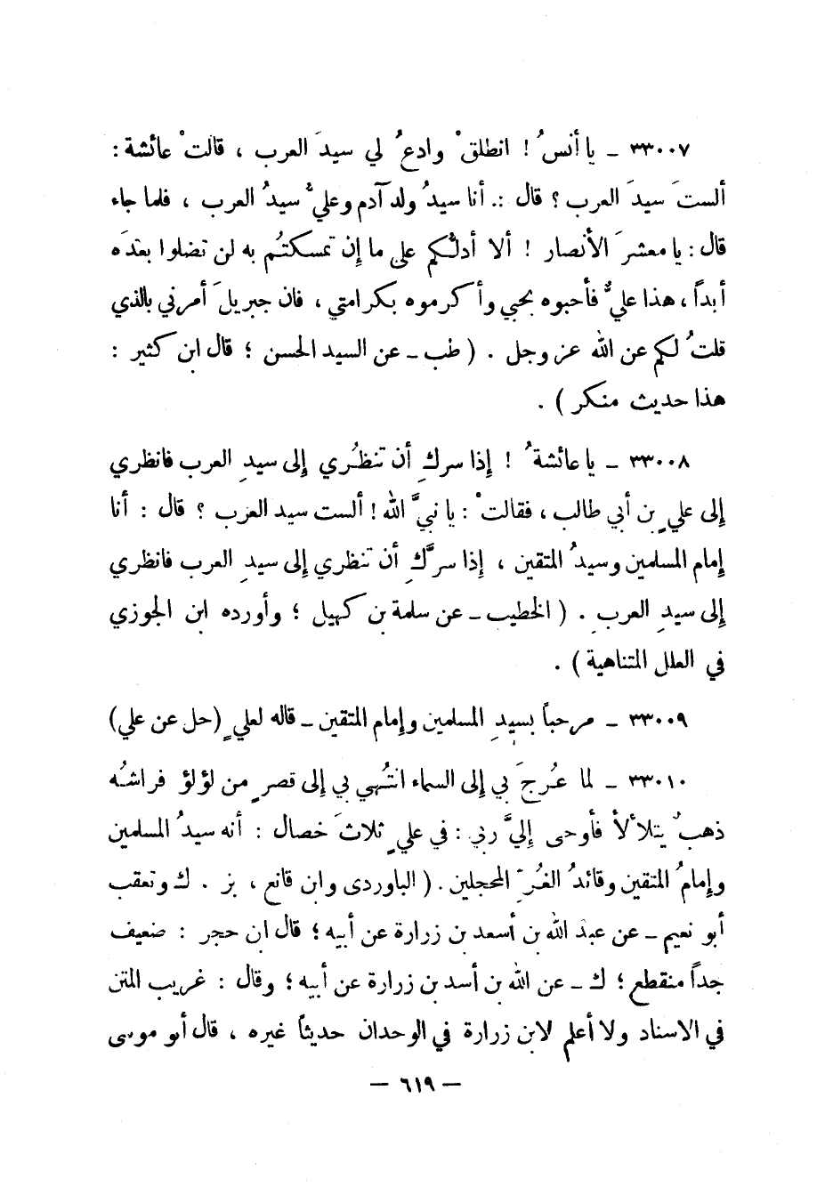 33007- يا أنس! انطلق وادع لي سيد العرب، قالت عائشة: ألست سيد العرب؟ قال: أنا سيد ولد آدم وعلي سيد العرب، فلما جاء قال: يا معشر الأنصار! ألا أدلكم على ما إن تمسكتم به لن تضلوا بعده أبدا، هذا علي فأحبوه بحبي وأكرموه بكرامتي، فإن جبريل أمرني بالذي قلت لكم عن الله عز وجل. "طب - عن السيد الحسن؛ قال ابن كثير: هذا حديث منكر".