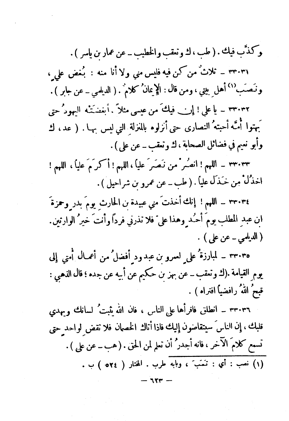 33031- ثلاث من كن فيه فليس مني ولا أنا منه: بغض علي، ونصب 1 أهل بيتي، ومن قال: الإيمان كلام. "الديلمي - عن جابر".