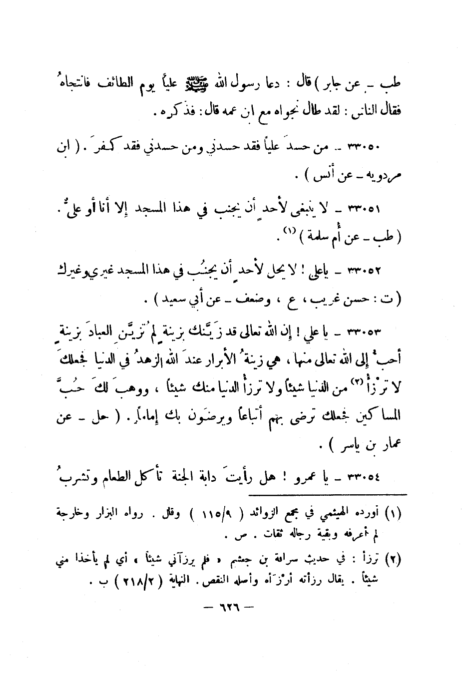 33052- يا علي! لا يحل لأحد أن يجنب في هذا المسجد غيري وغيرك. "ت: حسن غريب، ع، وضعف - عن أبي سعيد".