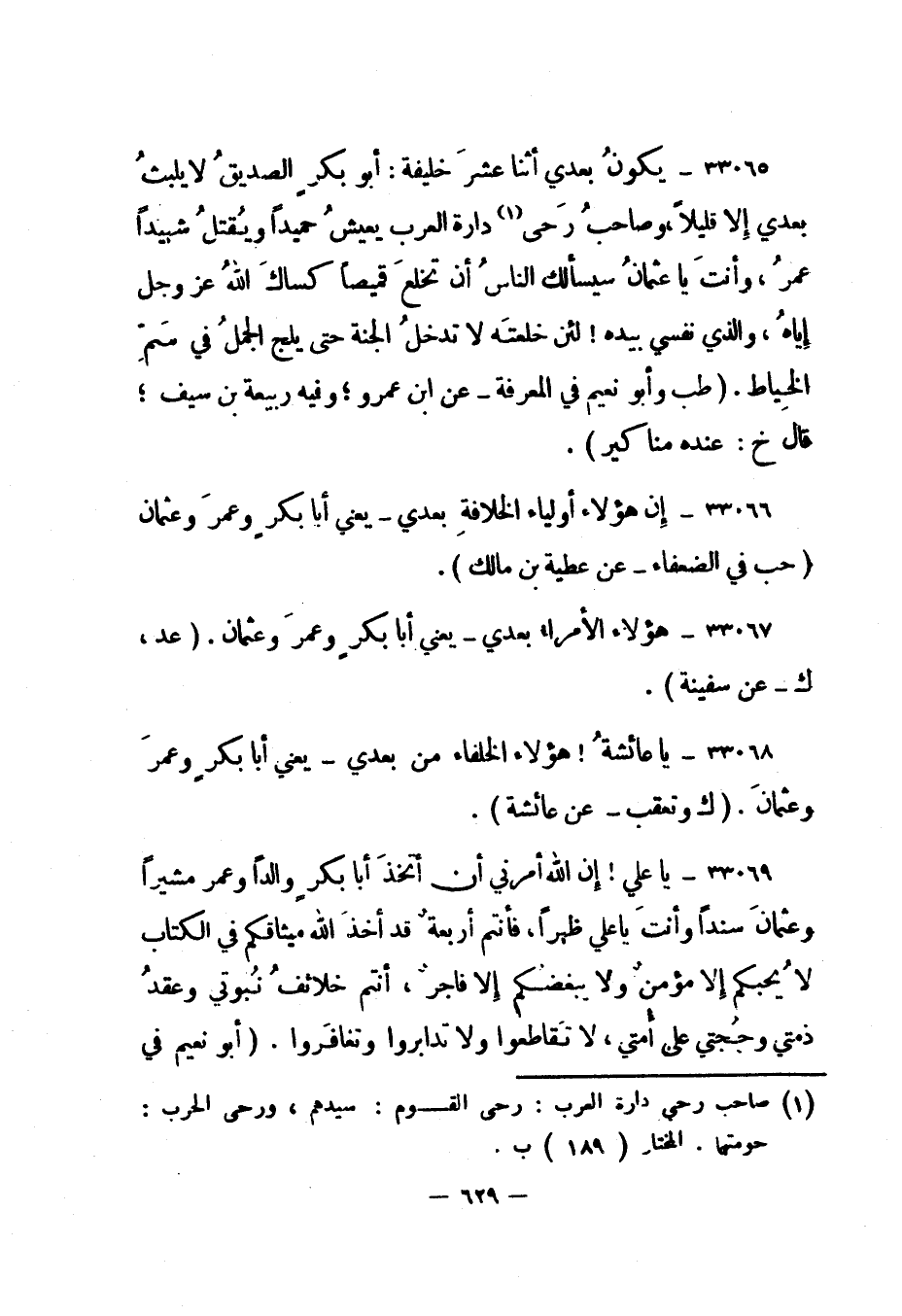 33066- إن هؤلاء أولياء الخلافة بعدي - يعني أبا بكر وعمر وعثمان. "حب في الضعفاء - عن عطية بن مالك".
