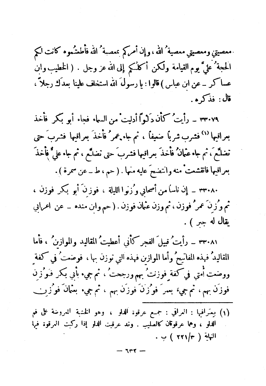 33081- رأيت قبيل الفجر كأني أعطيت المقاليد والموازين، فأما المقاليد فهذه المفاتيح وأما الموازين فهذه التي توزن بها، فوضعت في كفة ووضعت أمتي في كفة فوزنت بهم ورجحت، ثم جيء بأبي بكر فوزن فوزن بهم، ثم جيء بعمر فوزن فوزن بهم، ثم جيء بعثمان فوزن