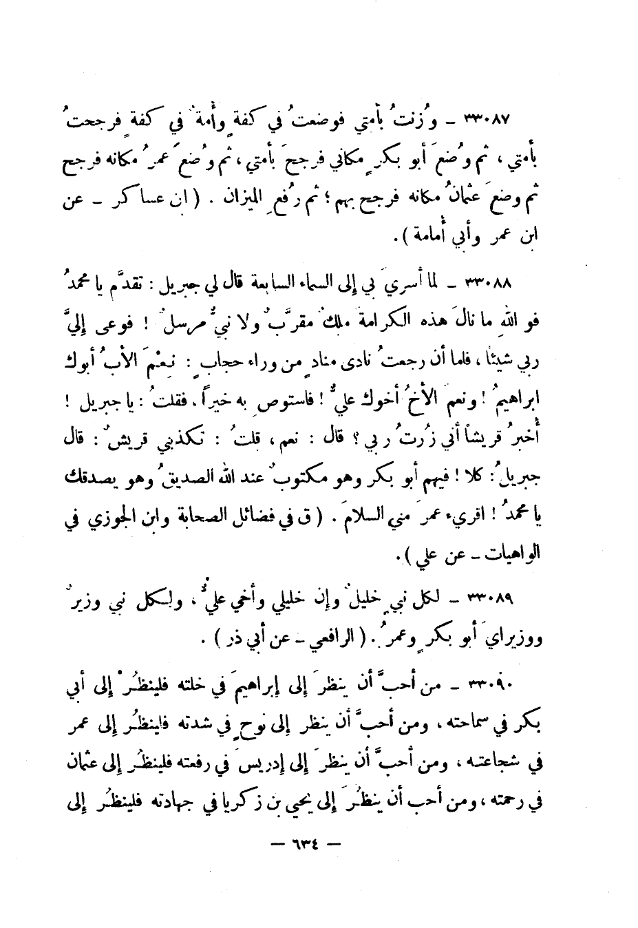 33087- وزنت بأمتي فوضعت في كفة وأمة في كفة فرجحت بأمتي، ثم وضع أبو بكر مكاني فرجح بأمتي، ثم وضع عمر مكانه فرجح ثم وضع عثمان مكانه فرجح بهم؛ ثم رفع الميزان. "ابن عساكر - عن ابن عمر وأبي أمامة".