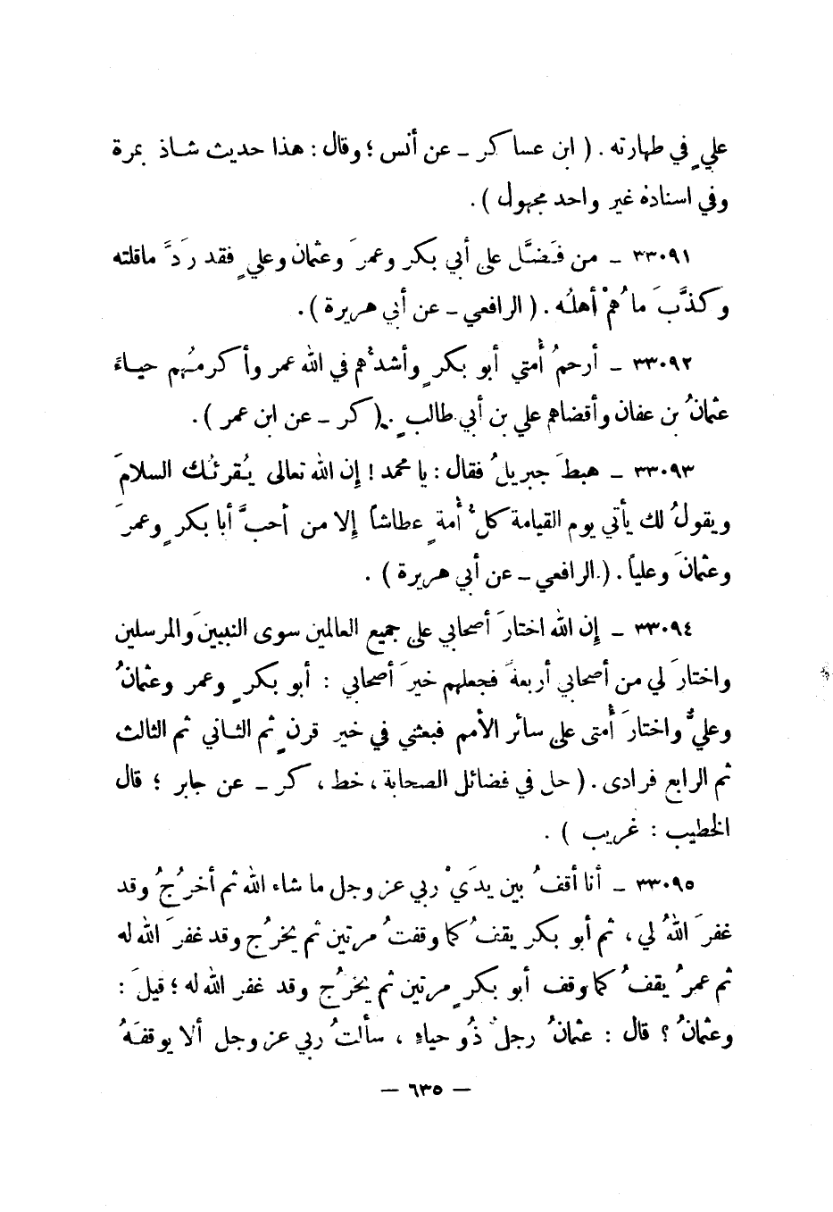 33093- هبط جبريل فقال: يا محمد! إن الله تعالى يقرئك السلام ويقول لك يأتي يوم القيامة كل أمة عطاشا إلا من أحب أبا بكر وعمر وعثمان وعليا. "الرافعي - عن أبي هريرة".
