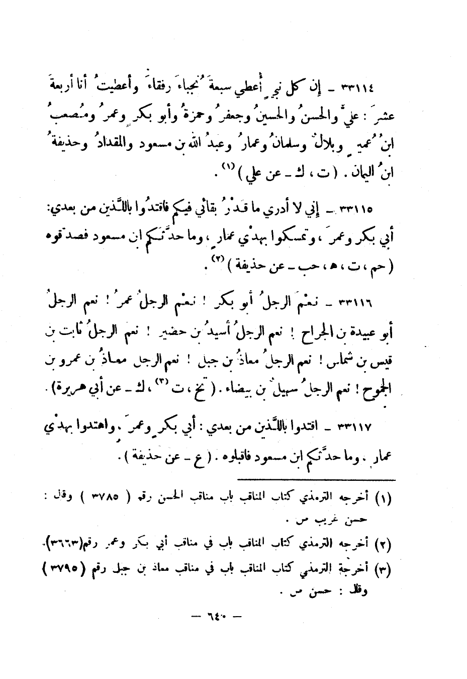 33114- إن كل نبي أعطي سبعة نجباء رفقاء وأعطيت أنا أربعة عشر: علي والحسن والحسين وجعفر وحمزة وأبو بكر وعمر ومصعب ابن عمير وبلال وسلمان وعمار وعبد الله بن مسعود والمقداد وحذيفة ابن اليمان. "ت، ك - عن علي"1.
