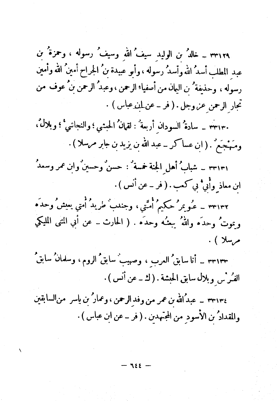 33134- عبد الله بن عمر من وفد الرحمن، وعمار بن ياسر من السابقين والمقداد بن الأسود من المجتهدين. "فر - عن ابن عباس".