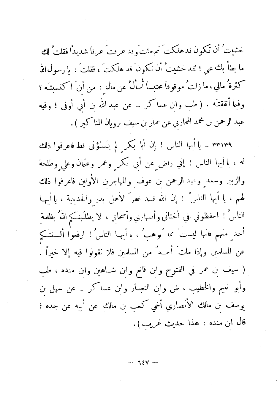 خشيت أن تكون قد هلكت ثم جئت وقد عرقت عرقا شديدا فقلت لك ما بطأ بك عني؟ لقد خشيت أن تكون قد هلكت، فقلت: يا رسول الله كثرة مالي، ما زلت موقوفا محتبسا أسأل عن مال: من أين اكتسبته؟ وفيما أنفقته. "طب وابن عساكر - عن عبد الله بن أبي أوفى؛ وفيه عبد الرحمن بن محمد المحاربي عن عمار بن سيف يرويان المناكير".