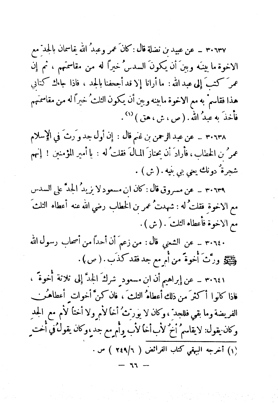 30639- عن مسروق قال: كان ابن مسعود لا يزيد الجد على السدس مع الإخوة فقلت له: شهدت عمر بن الخطاب رضي الله عنه أعطاه الثلث مع الإخوة فأعطاه الثلث. "ش".