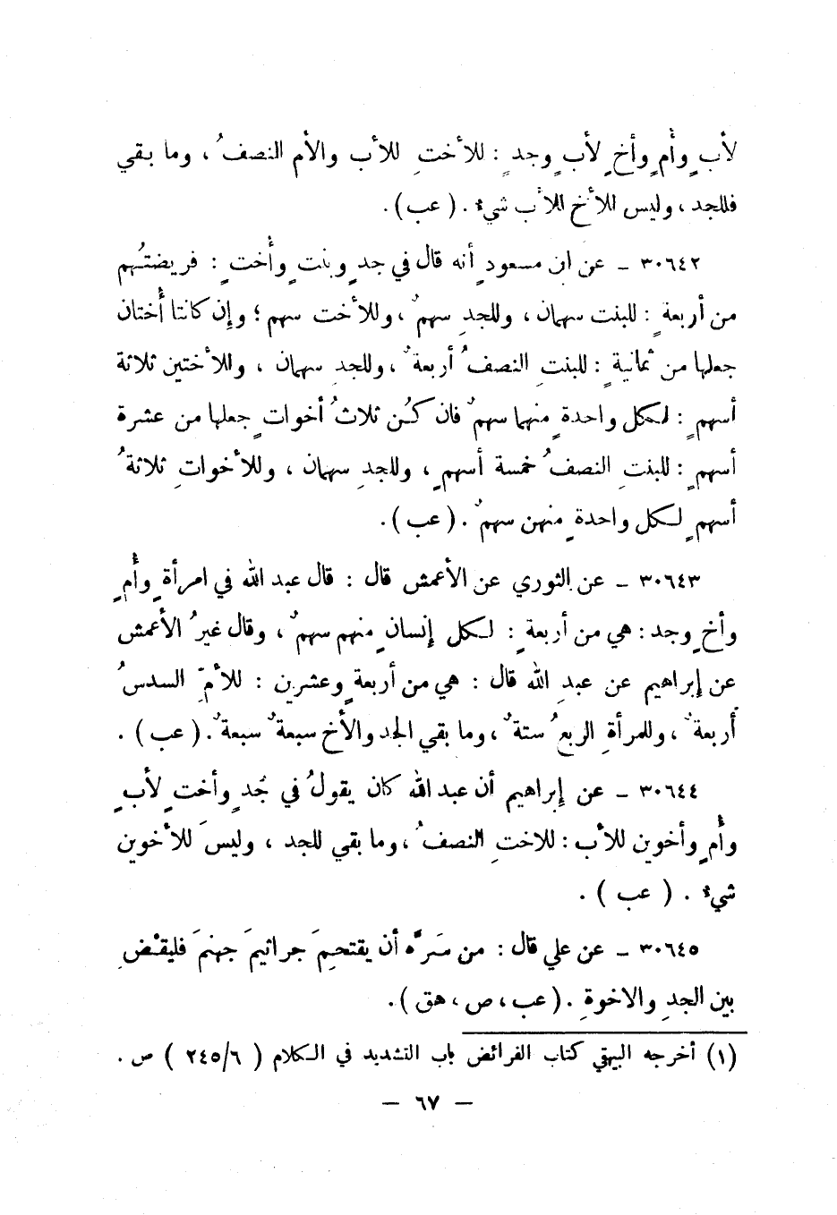 30645- عن علي قال: من سره أن يقتحم جراثيم جهنم فليقض بين الجد والأخوة. "عب، ص، هق"1.