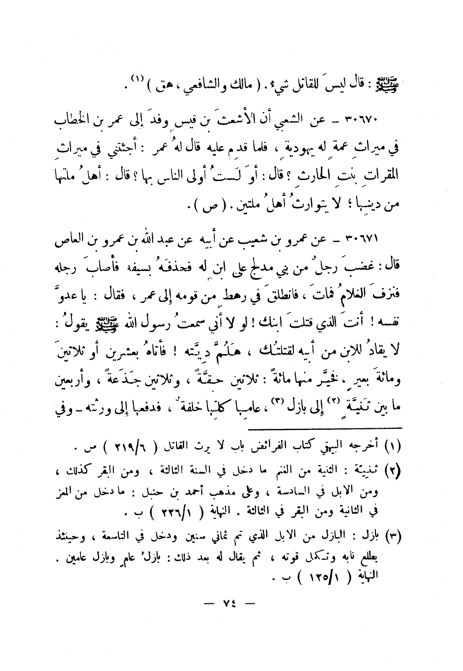 30671- عن عمرو بن شعيب عن أبيه عن عبد الله بن عمرو بن العاص قال: غضب رجل من بني مدلج على ابن له فحذفه بسيفه فأصاب رجله فنزف الغلام فمات، فانطلق في رهط من قومه إلى عمر، فقال: يا عدو نفسه! أنت الذي قتلت ابنك! لولا أني سمعت رسول الله صلى الله عليه وسلم يقول: لا يقاد للإبن من أبيه لقتلتك، هلم ديته! فأتاه بعشرين أو ثلاثين ومائة بعير، فخير منها مائة: ثلاثين حقة، وثلاثين جذعة، وأربعين ما بين ثنية 2 إلى بازل 3، عامها كلها خلفة، فدفعها إلى ورثته - وفي