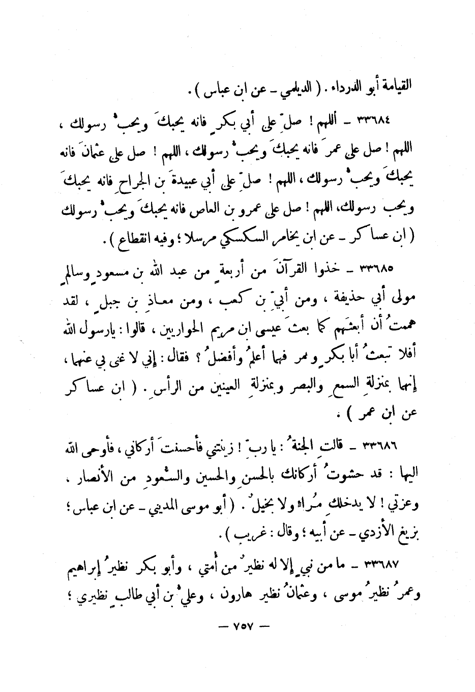 33687- ما من نبي إلا له نظير من أمتي، وأبو بكر نظير إبراهيم وعمر نظير موسى، وعثمان نظير هارون، وعلي بن أبي طالب نظيري؛