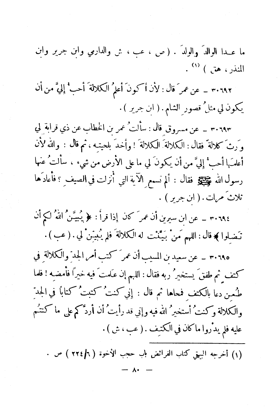 30692- عن عمر قال: لأن أكون أعلم الكلالة أحب إلي من أن يكون لي مثل قصور الشام. "ابن جرير".