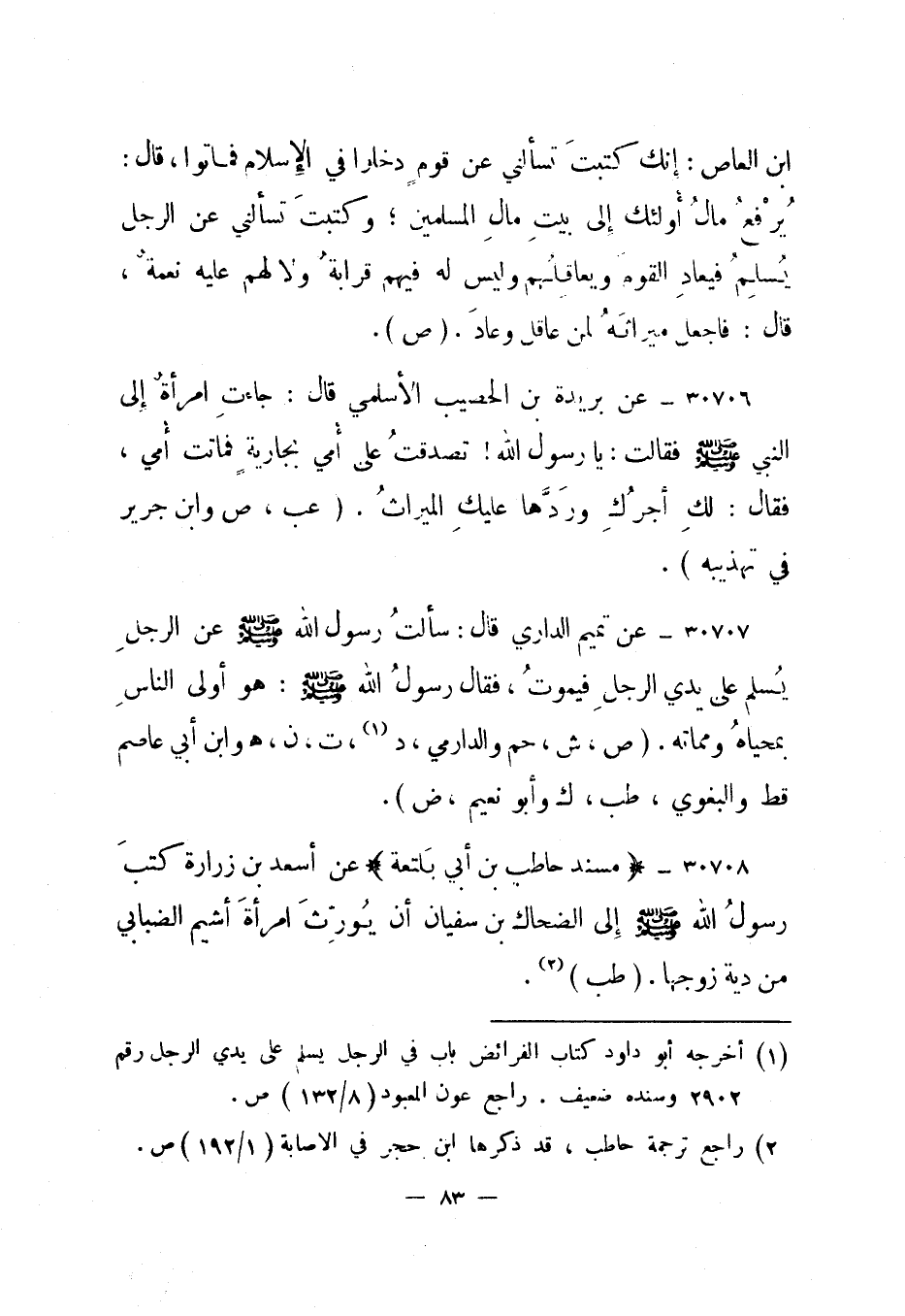 30708- "مسند حاطب بن أبي بلتعة" عن أسعد بن زرارة كتب رسول الله صلى الله عليه وسلم إلى الضحاك بن سفيان أن يورث امرأة أشيم الضبابي من دية زوجها. "طب" 2.