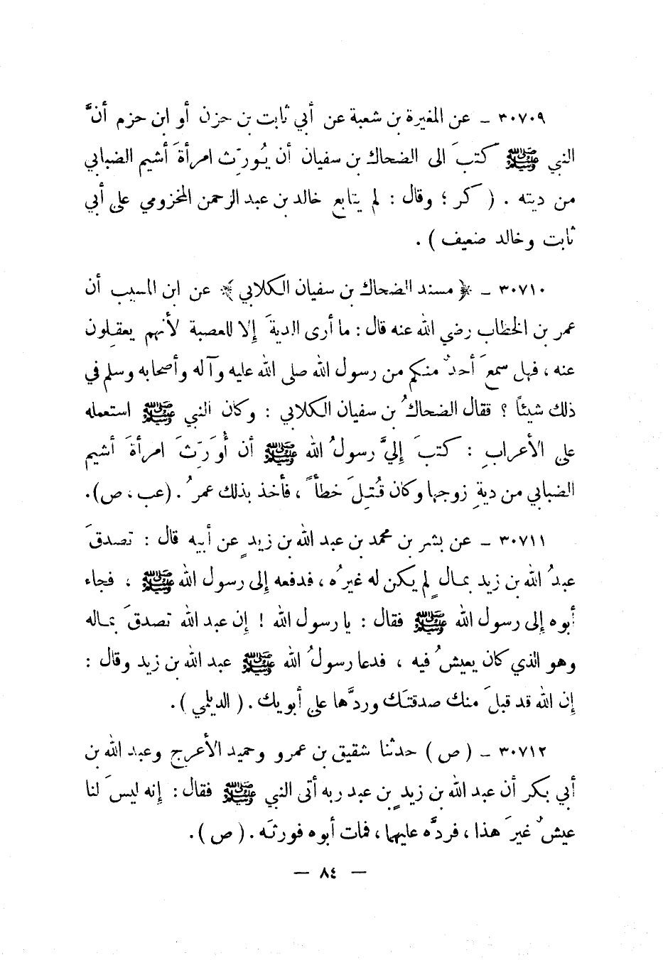 30710- "مسند الضحاك بن سفيان الكلابي" عن ابن المسيب أن عمر بن الخطاب رضي الله عنه قال: ما أرى الدية إلا للعصبة لأنهم يعقلون عنه، فهل سمع أحد منكم من رسول الله صلى الله عليه وآله وأصحابه وسلم في ذلك شيئا؟ فقال الضحاك بن سفيان الكلابي: وكان النبي صلى الله عليه وسلم استعمله على الأعراب: كتب إلي رسول الله صلى الله عليه وسلم أن أورث امرأة أشيم الضبابي من دية زوجها وكان قتل خطأ، فأخذ بذلك عمر. "عب، ص".