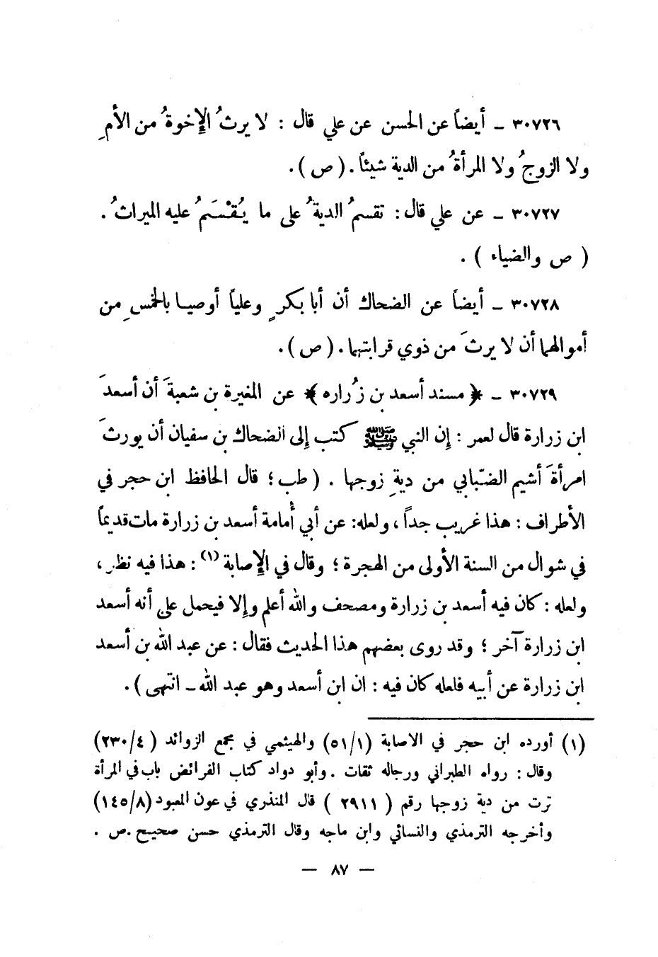1 أورده ابن حجر في الإصابة "1/51" والهيثمي في مجمع الزوائد "4/230" وقال: رواه الطبراني ورجاله ثقات. وأبو داود كتاب الفرائض باب في المرأة ترث من دية زوجها رقم "2911" قال المنذري في عون المعبود "8/145" وأخرجه الترمذي والنسائي وابن ماجه وقال الترمذي حسن صحيح. ص".