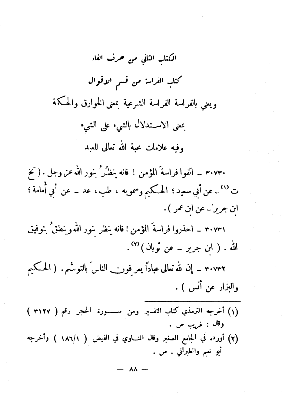 30731- احذروا فراسة المؤمن! فإنه ينظر بنور الله وينطق بتوفيق الله. "ابن جرير - عن ثوبان" 2.