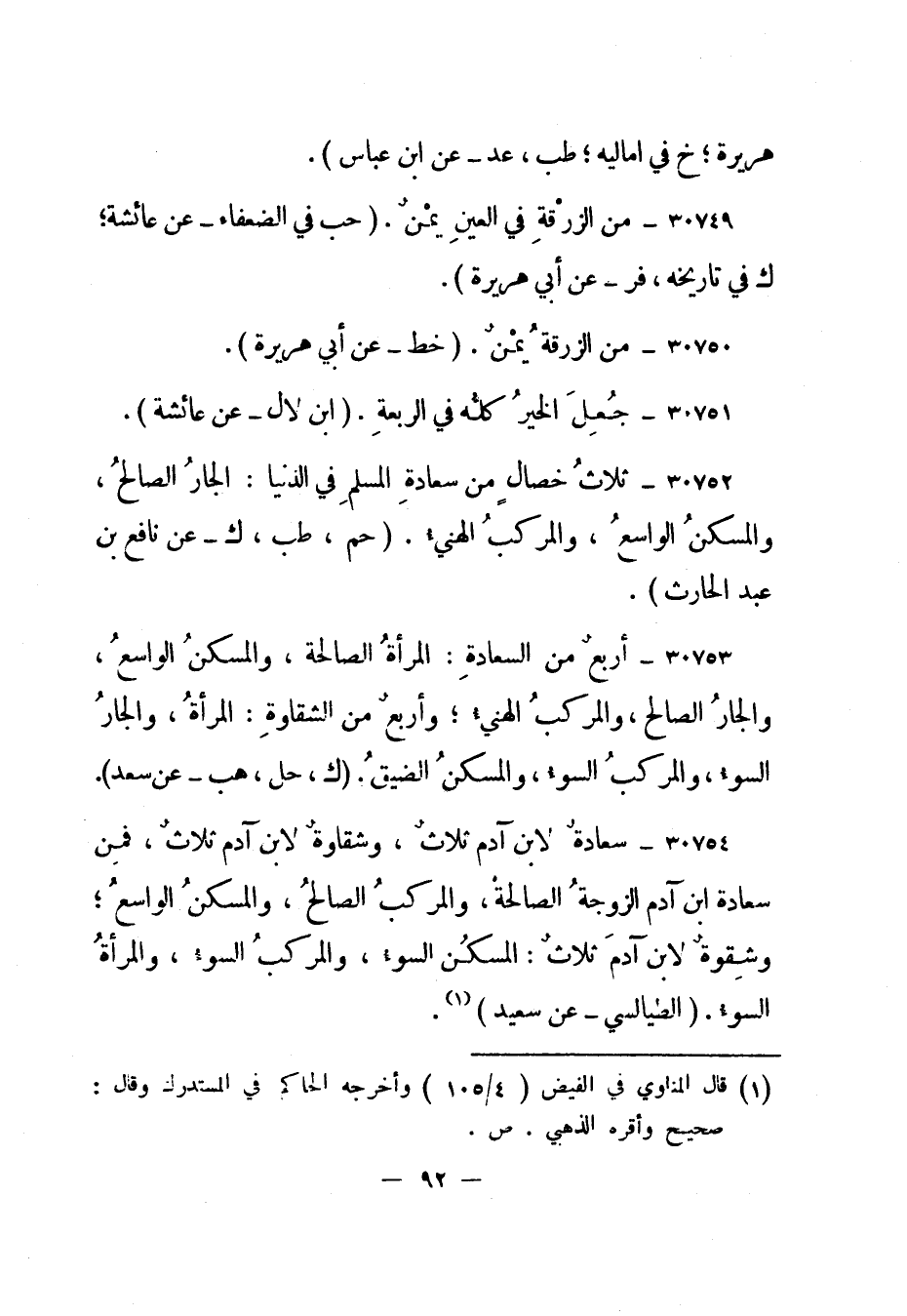 30754- سعادة لابن آدم ثلاث، وشقاوة لابن آدم ثلاث، فمن سعادة ابن آدم الزوجة الصالحة، والمركب الصالح، والمسكن الواسع؛ وشقوة لابن آدم ثلاث: المسكن السوء، والمركب السوء، والمرأة السوء. "الطيالسي - عن سعيد" 1.
