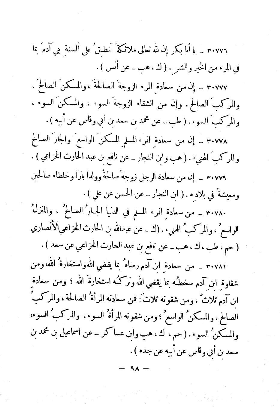 30778- إن من سعادة المرء المسلم المسكن الواسع والجار الصالح والمركب الهنيء. "هب وابن النجار - عن نافع بن عبد الحارث الخزاعي".