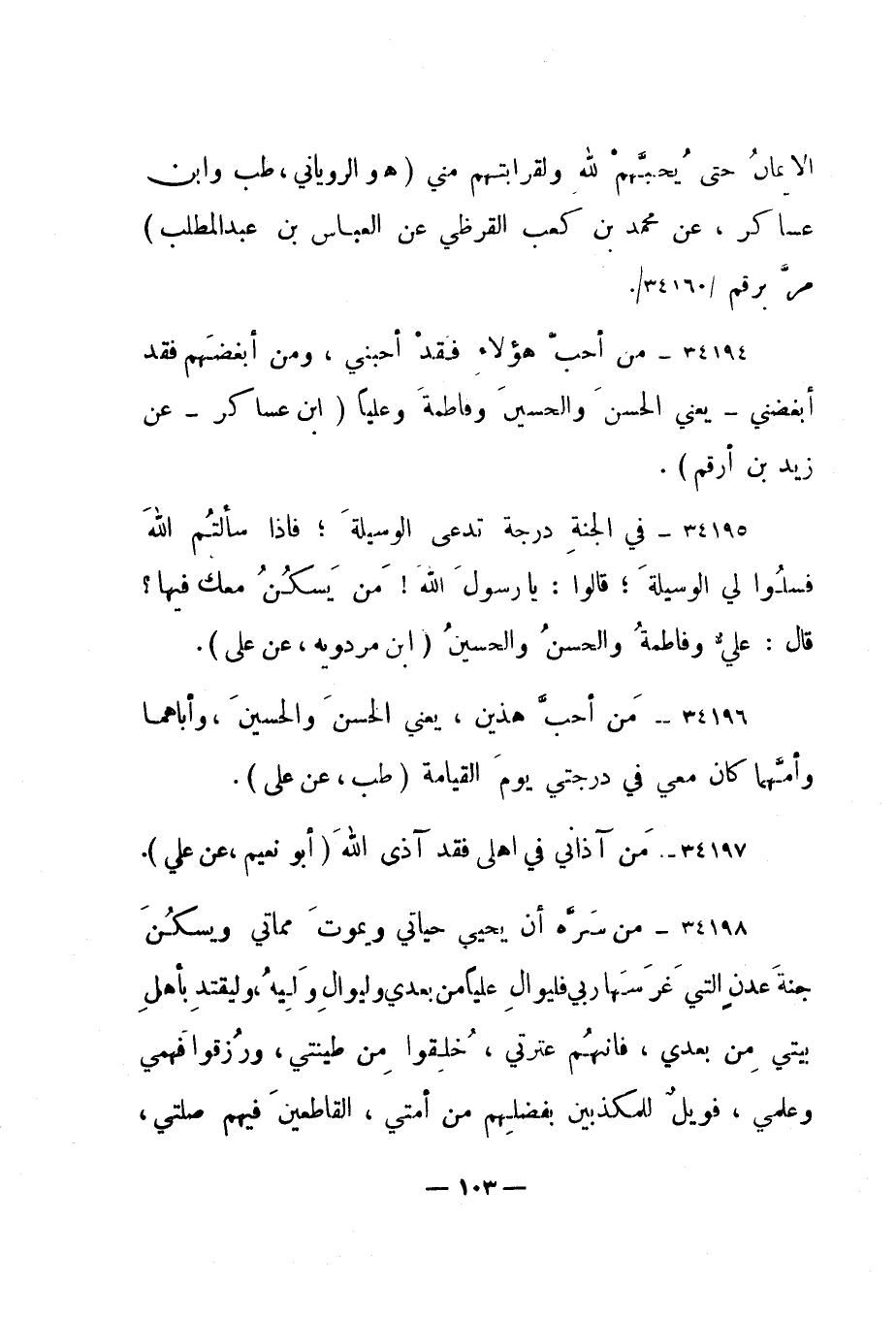 34194- "من أحب هؤلاء فقد أحبني، ومن أبغضهم فقد أبغضني - يعني الحسن والحسين وفاطمة وعليا. " ابن عساكر - عن زيد بن أرقم".