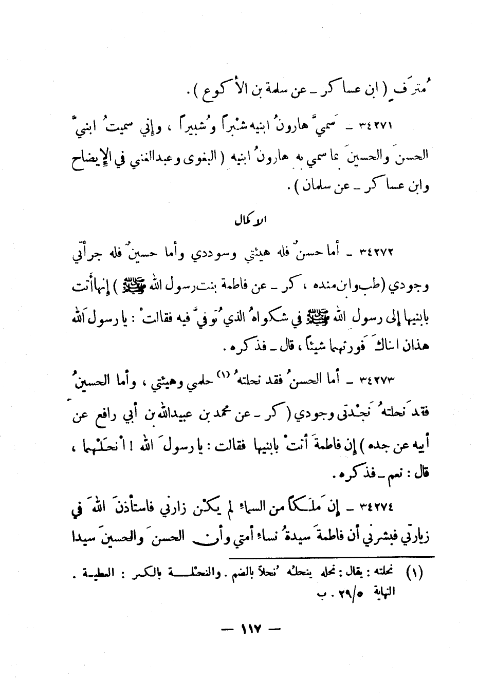 34271- "سمي هارون ابنيه شبرا وشبيرا، وإني سميت ابني الحسن والحسين بما سمي به هارون ابنيه. " البغوي وعبد الغني في الإيضاح وابن عساكر - عن سلمان".