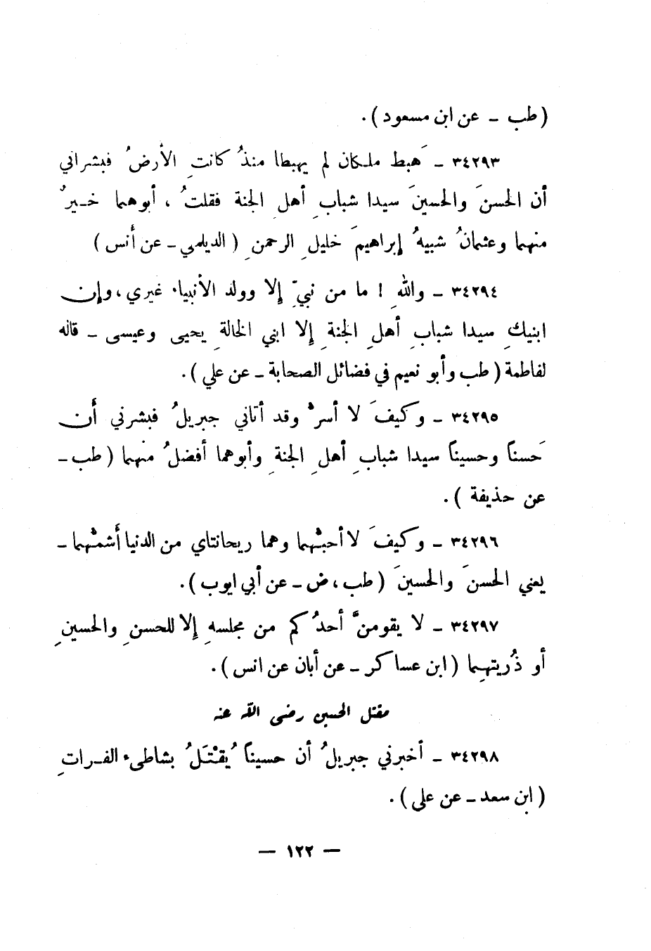 34298- "أخبرني جبريل أن حسينا يقتل بشاطئ الفرات." ابن سعد - عن علي".