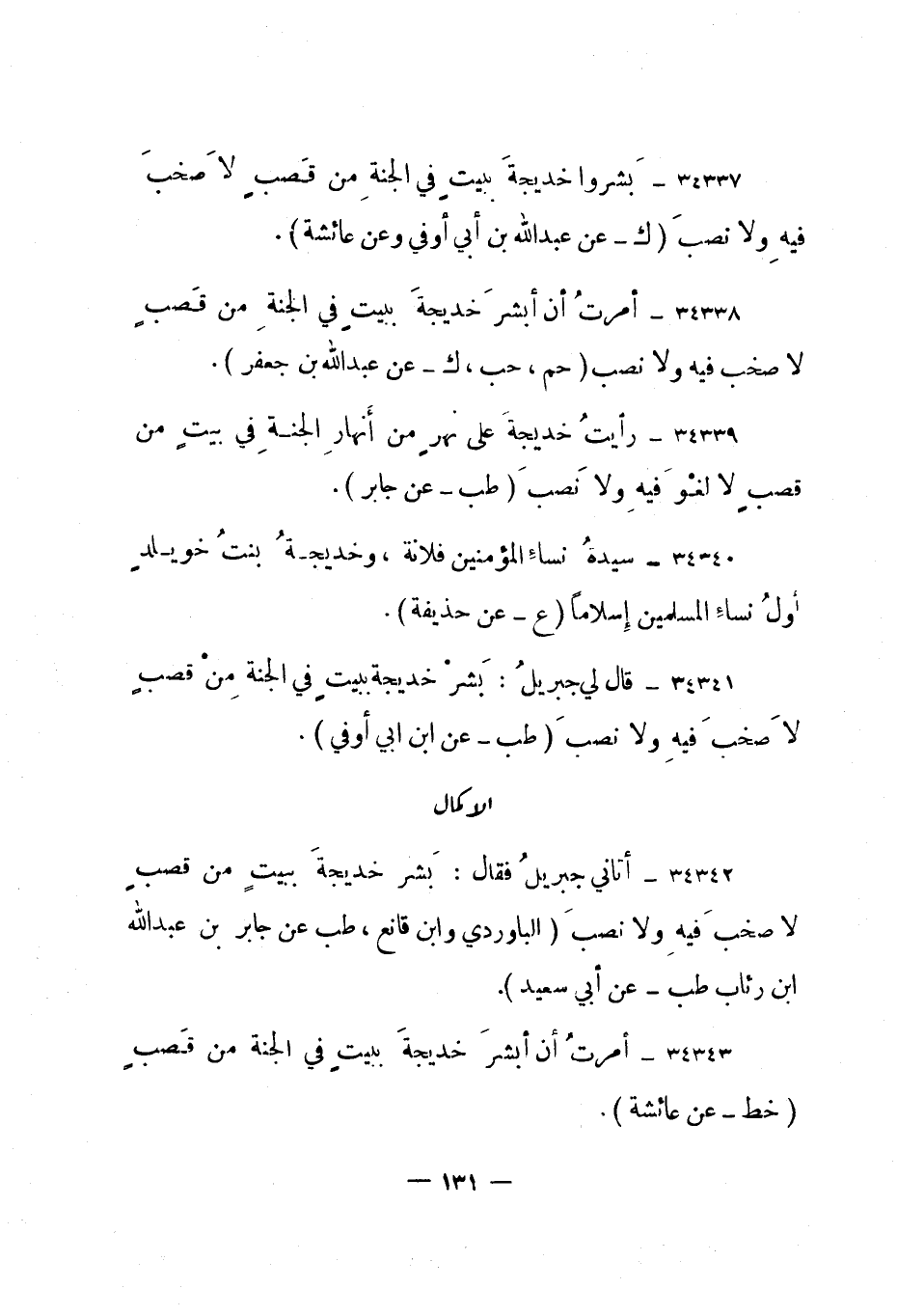 34341- "قال لي جبريل: بشر خديجة ببيت في الجنة من قصب لا صخب فيه ولا نصب." طب - عن ابن أبي أوفى".